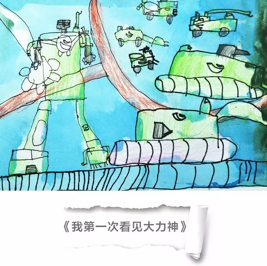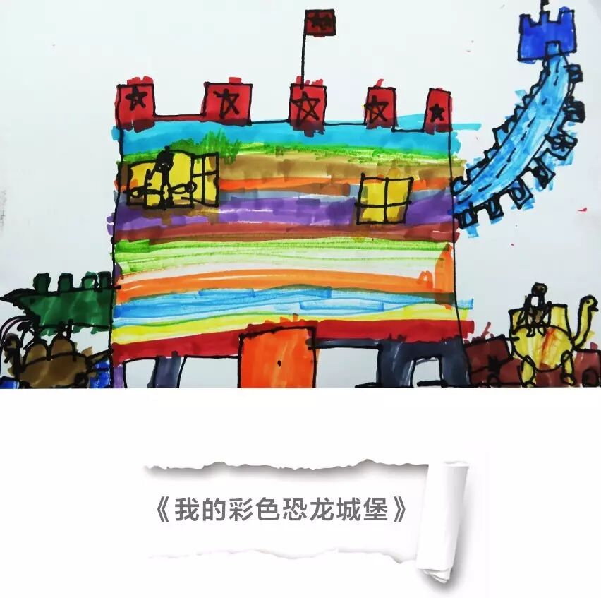 这幅画充满天马行空的创意,把自己爱好的恐龙和今天的主题很好的结合在一起,把城堡变成了恐龙的身子,把蜿蜒的马路变成了恐龙的尾巴,而且画面色彩层次感强,造型夸张有力,带有很强烈大小对比,而且画面有很多符号装饰,线的运用也很有节奏感。