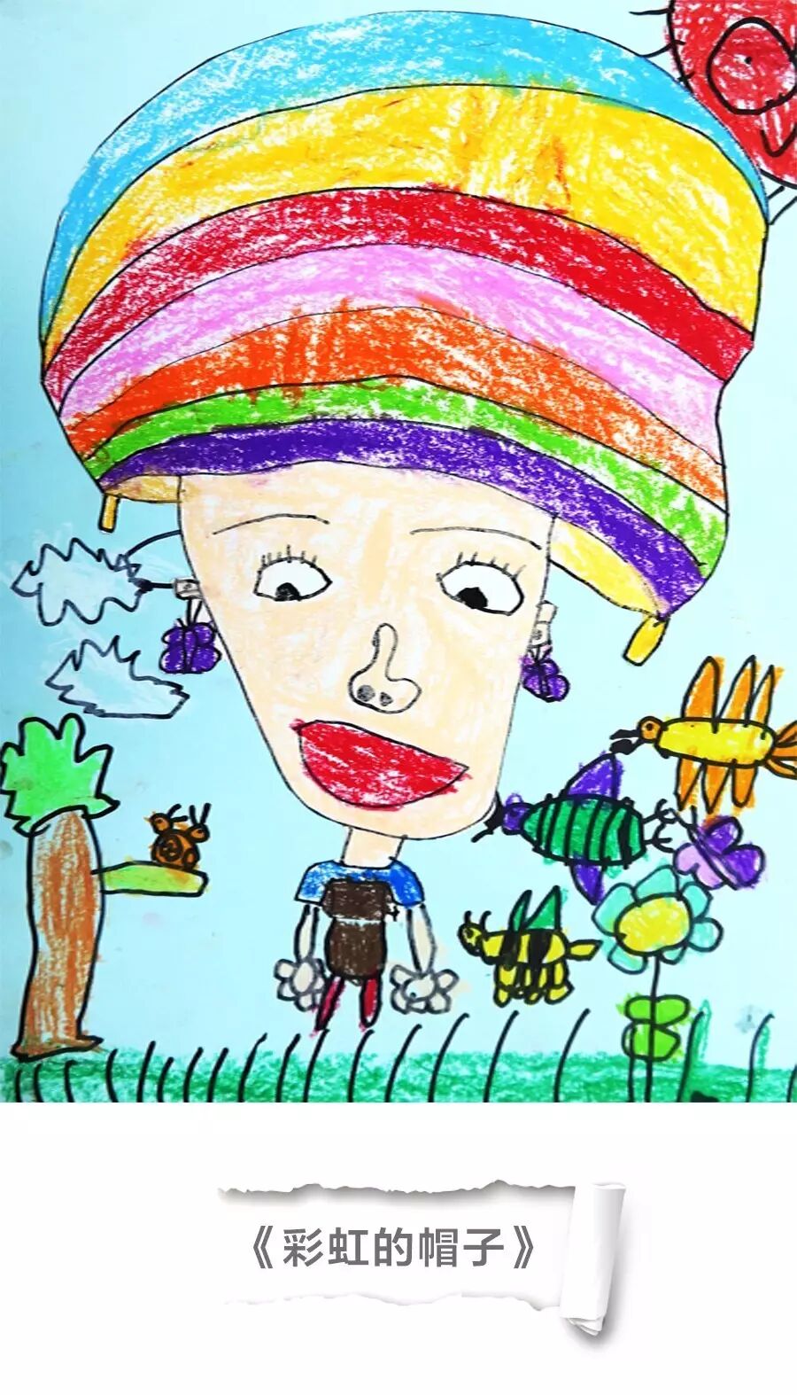 这幅作品充满情绪上的夸张,把人的身体比例进行了很好诠释,使这个主人身体比例形成了一个从头到脚的逆反形体夸张。画中人物是一个少数民族的少女,孩子很好的将彩虹和少数民族的独具特色帽子结合在一起,而且人物形态夸张表情到位。像我们展现了一副漂亮的少数民族少女,和大自然和谐相处的场景画面。