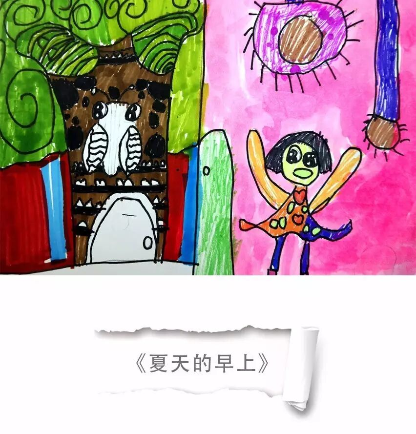 这幅画充满很强烈的炎热夏日感,运用了大面积的红色背景,烘托夏日的燥热。大树变成了一座小房子,大树房子上还有很多精心设计的花纹,使画面更具有趣味性,。画面中分为左右两部分,运用了绿色和红色作为主基色,从凉爽到颜色的跨度,从知了的鸣叫开始了。