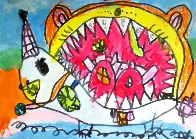 《小乌龟的大嘴巴》嘟嘟小朋友由大嘴巴的主题想到了老虎的大嘴巴变成了小乌龟的壳,小乌龟的嘴巴变成了蝴蝶的家,逻辑思维越来越强了!嘟嘟说:“小乌龟变成了一艘船在大海上面准备出行,上面还有大嘴巴变的游泳圈和救生衣。老虎的牙齿变成一个个小房间,老虎的舌头变成船舱,船舱外面还有一个花园,里面种了一朵漂亮的花朵!”想象力非常丰富!