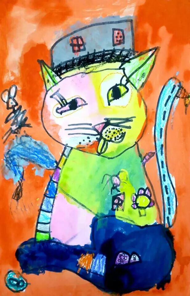 《小花猫的游乐场》嘟嘟小朋友由猫的主题联想到了小花猫的游乐场,而且还戴着帽子和围巾,让人不禁联想到了威武的黑猫警长,非常经典的形象。嘟嘟说:“小花猫的围巾变成了水上游乐场的楼梯,身体变成了花园儿,尾巴变成了路灯,可以为大家照明。”