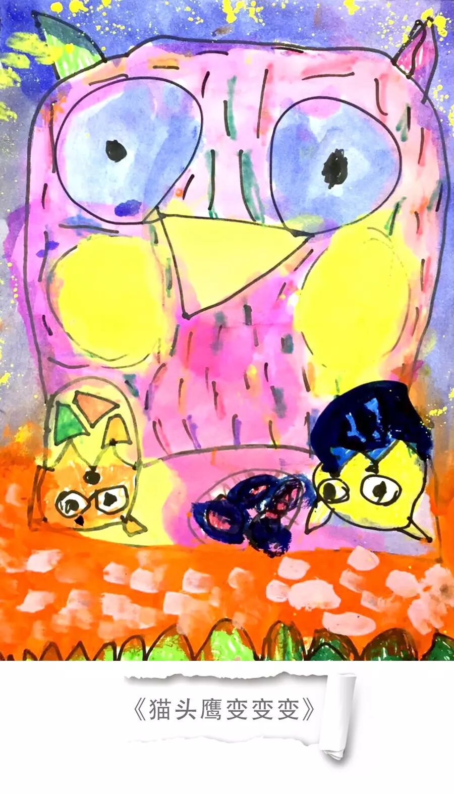三角形变成了猫头鹰的小嘴巴和小耳朵,今天的颜色运用了淡彩和厚涂相结合的方法,画面很有层次感,猫头鹰造型很有吴冠中大师的感觉,神态很灵动,非常有神韵!