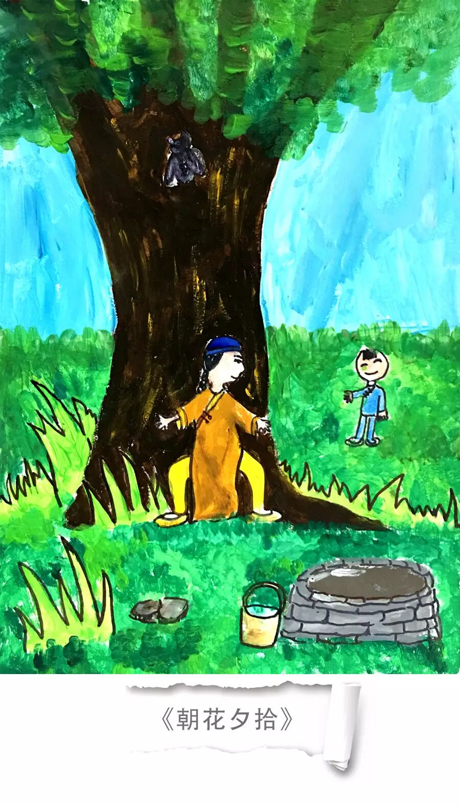 这是一幅为《朝花夕拾》所作的书本封面。树下的孩子做着游戏,一口水井把我们带回了当年学习课文的时代。