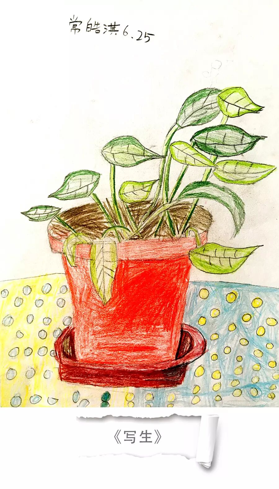 用写实的手法表现了盆景绿萝,花盆的形状刻画比较准确,绿萝的叶子有大有小且描绘出叶子之间的前后遮挡关系,运用大红色真实记录了花盆,花盆里面则采用深色,成功表现出花盆的亮面和暗面,塑造出花盆的立体感和空间感。盆托是涂深红色区别于花盆。小朋友观察的非常仔细用深浅不一的绿色表现了不同的叶子,有正面的,还有背面的叶子,层次非常丰富。简单的勾勒了衬布的形状,与整个花盆形成简与繁的对比。整幅画面十分完整。