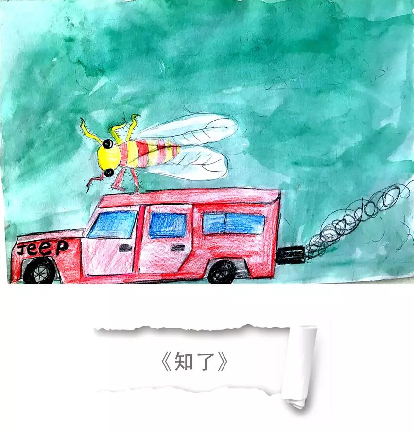 用水彩颜料和彩铅结合的方式表现了可爱的知了。这节课的难点是用水彩颜料表现半透明的知了的翅膀,画面上有辆大大的红色吉普车,特比帅气。中间是只可爱的知了,这可不是普通的知了,他是会变魔法的知了,不信你看,触碰在吉普车上的脚都变成红色的了。背景是淡淡的绿色,给人清凉夏天的感觉。这节课让小朋友感受水彩的性质和乐趣。