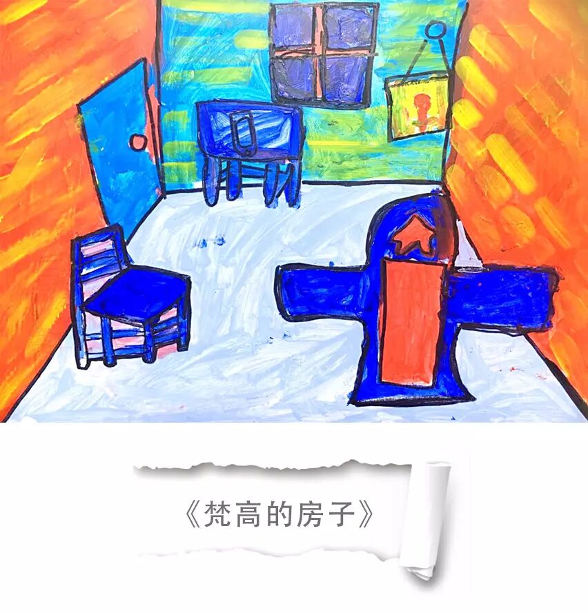 这幅画用的是丙烯颜料表现荷兰画家梵高的经典作品。小朋友运用明快亮丽的颜色表现了屋子里的场景——椅子、床、房门、桌子、手机、墙上的相框,很有层次感。画面遵循了近大远小的透视关系,如近处的地板大远处的地板小等,空间感很强。用红黄蓝三原色装饰整个房间,视觉效果极强。用干笔沾少许黄色扫出肌理条纹,给人以动感。小作者根据自己的想法改变了大师的作品,整幅画面更具童趣。