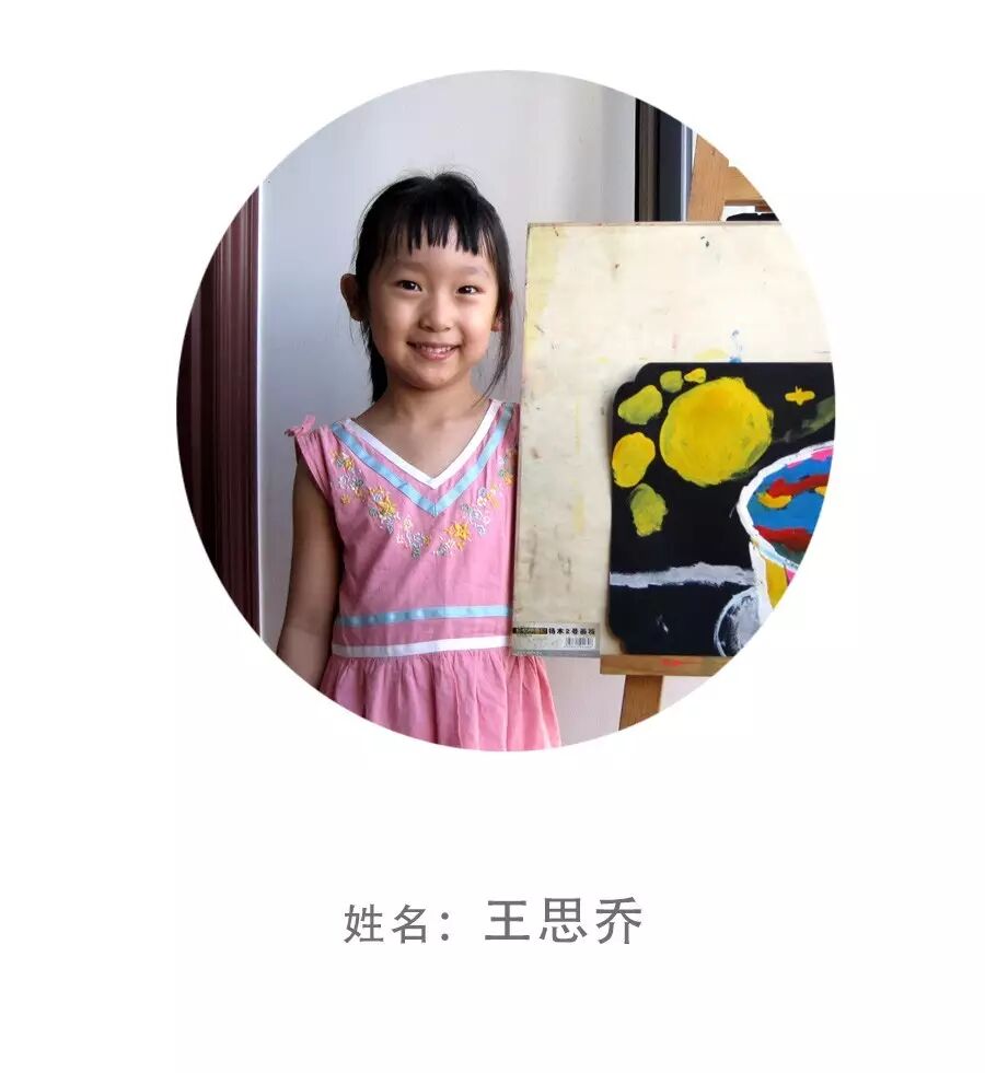 王思乔、小名乔乔,乔乔是一位特别可爱的小女孩。个子长得高高的、说话比较腼腆。乔乔是一个画画特别认真的小女孩、每次遇到困难的时候、都会瞪着大眼睛看着我、虚心的向我请教。画出漂亮的作品时特别的自豪和开心。希望乔乔以后可以自信一些、那样子的的乔乔才会更加可爱呦。