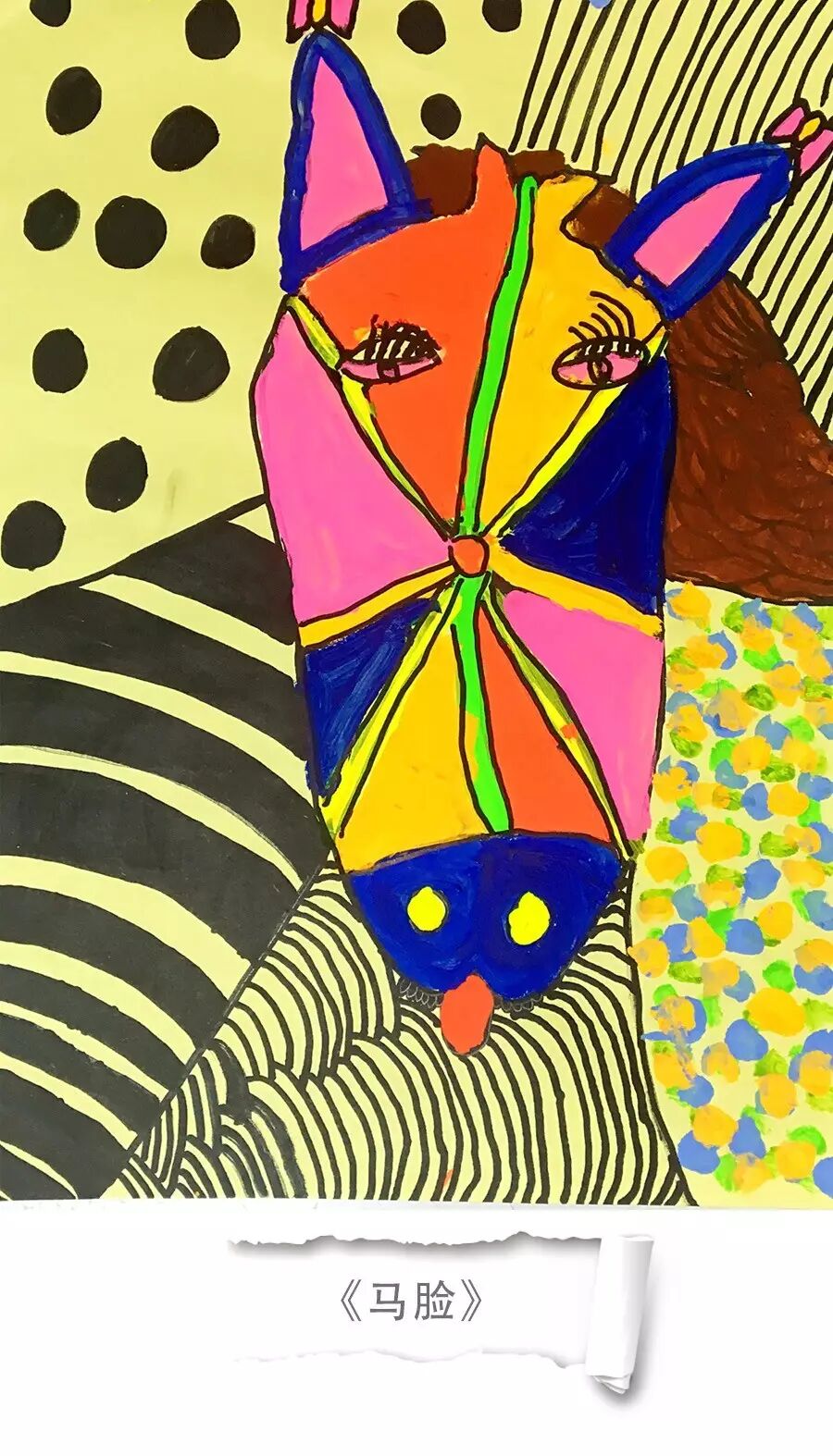 这幅作品采用了点线面的表现方法、成次感分明。首先马的头部特征刻画的比较到位、脸部被划分成了很多的彩色方块、耳朵上也戴上了蝴蝶结、伸着红色的小舌头。头顶的头发也随风飘了起来,比较具有动感。马的身体用了黑白的弧线来表现。整幅画面一动一静、简单与复杂相结合、好玩有趣、富有童真。