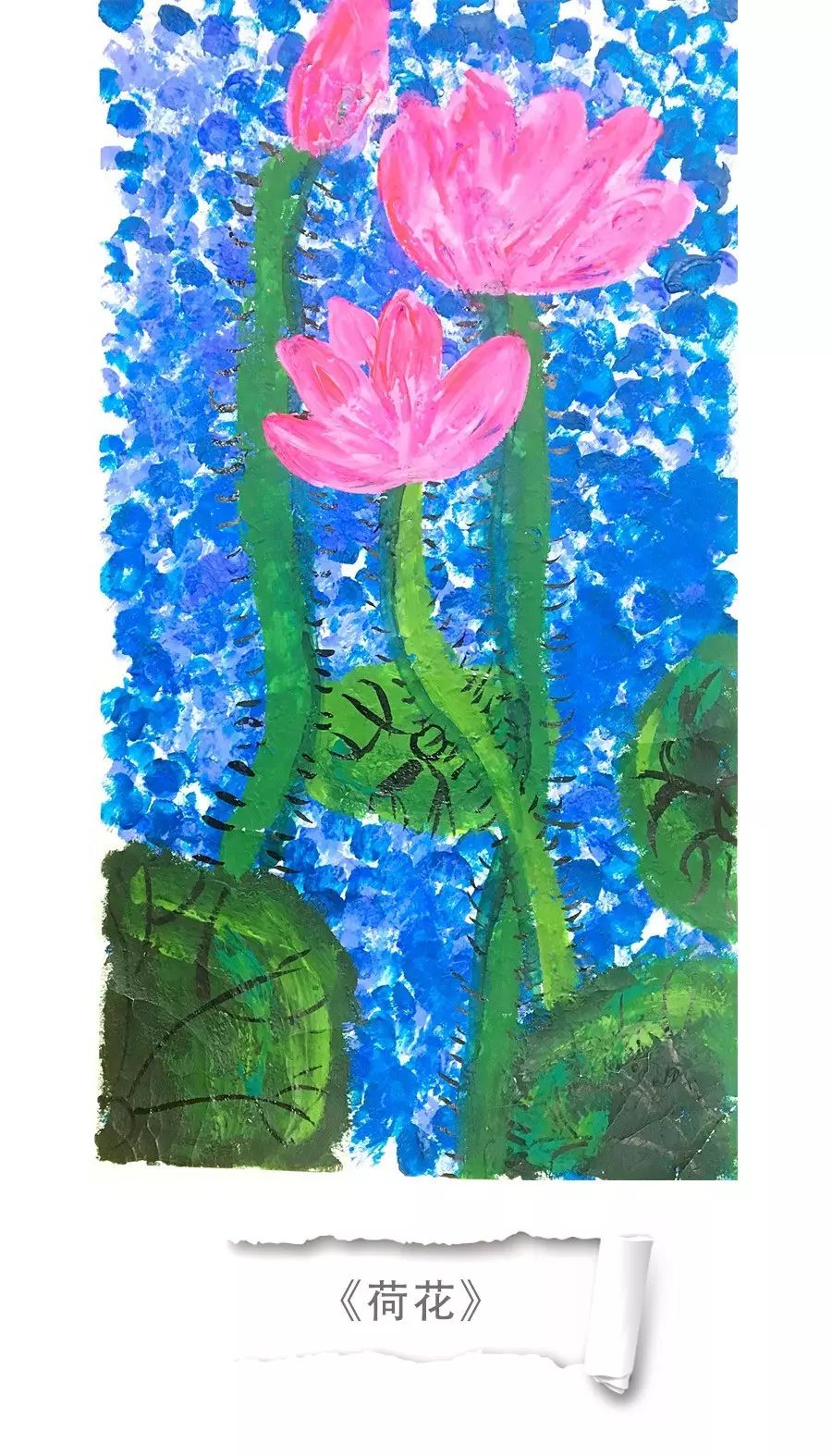 这一副画面采用的是竖构图、画面整体颜色亮丽。背景采用了点彩的方法、并且具有深浅变化。前面的荷叶有大有小、错落有致。粗粗的叶柄表达出了孩子的稚嫩感、粉色的荷花表达出了娇艳欲滴的感觉。整幅画面把人带入到了荷花小池、嗅到了淡淡的荷香。