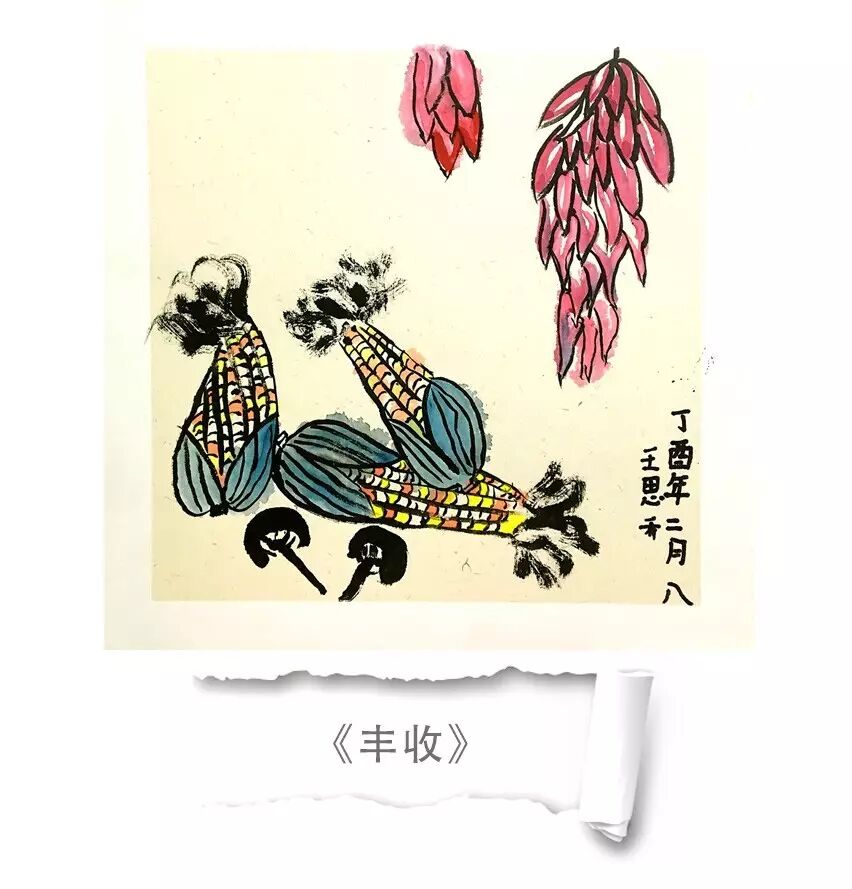 整幅画面的构图比较新颖。主体物玉米刻画的比较好玩、有胖胖的玉米、有斜着头部向下的玉米、玉米的毛发画的特别生动飘逸、散锋用的不错。在后面有两串红红的辣椒、一串长的、一串短的。中锋用笔感觉不错、如果再稍稍流畅、稳一点可能会更好。