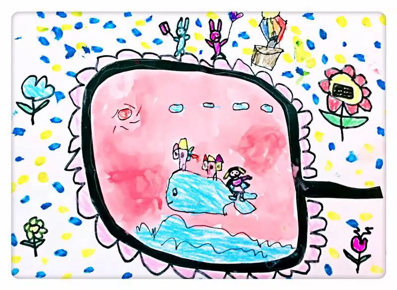放大镜用了极度夸张放大的手法,让里面的会飞的鲸鱼世界刻画的更加细致有内容。放大镜外面从远方乘坐热气球而来的小兔子们,增加了画面的趣味性和故事性。外面分散着事物让整个画面形散而神不散。