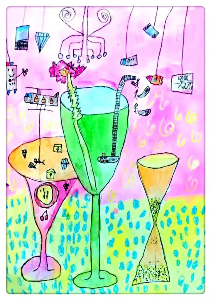 晶莹剔透的高脚杯原来是海底宝藏的储藏点,而吸管变换成了潜水艇的排气管,天空中的直升飞机给整个画面增加了律动感。画面上方挂着的手机、钻石、火箭等运用了散点式构图。使整个画面形散而神不散,自成一体。薄而透明的淡彩让整个画面透露着淡淡的奇幻感觉。