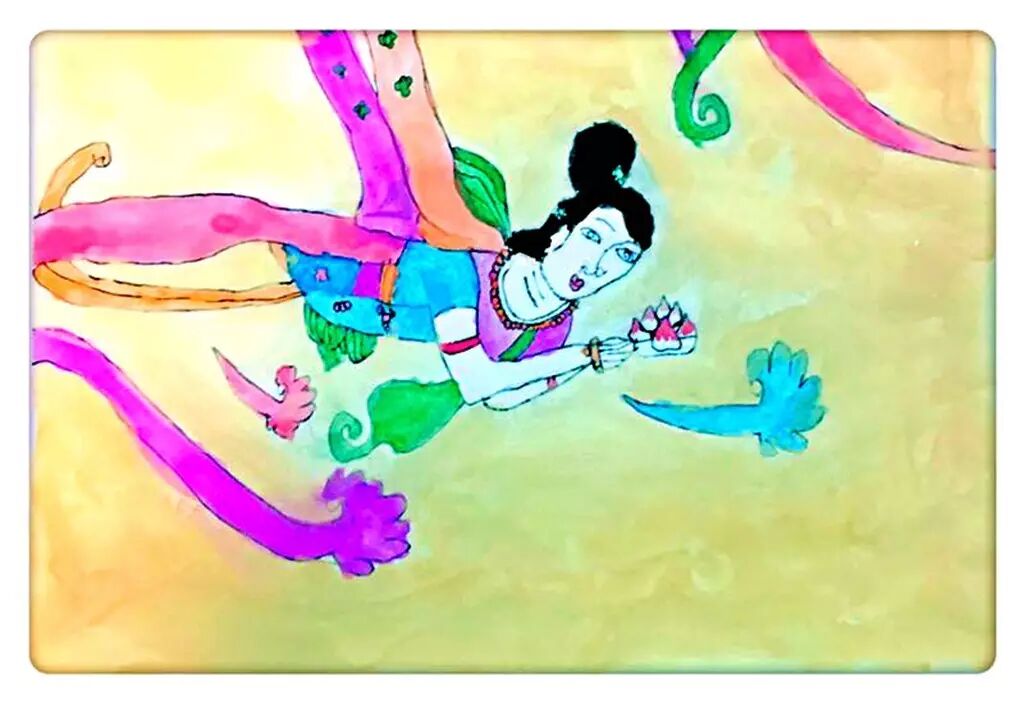 优美的飞天,是敦煌艺术的标志。马浩然小朋友描绘的飞天,飘曳的衣裙‘、’飞舞的彩带、载歌载舞凌空翱翔于天际。轻盈的姿态,头戴宝冠,束圆髻、气度豪迈大方,飞式动态描绘的有力,姿态自如优美,衣裙飘带的晕染和线条明朗清晰,祥云漂流,互相照应,自由欢乐,像一只轻盈的燕子飞于天际。
