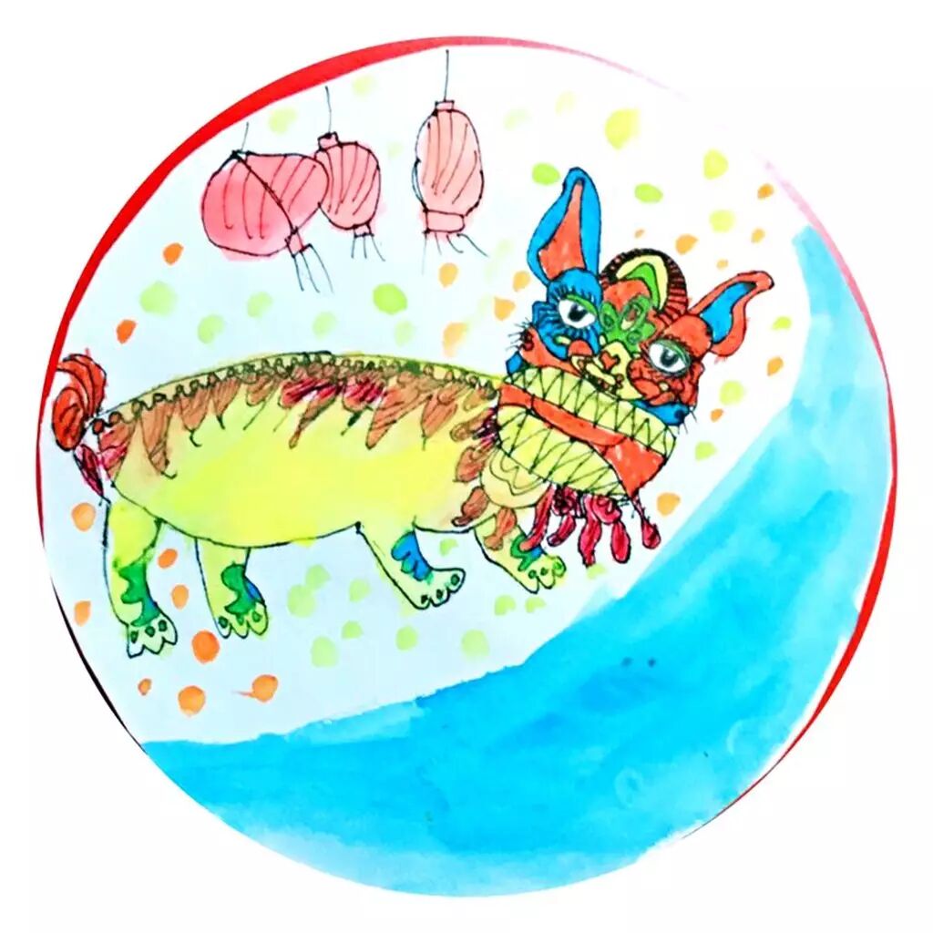迎神喜典而应运而生的舞狮,在马浩然小朋友妙笔生花的手里,仿佛有了静谧文静的气质。来到了水做的弯弯的月亮边,是要饮水,还是要观景,让人产生了遐想的空间。并且带来了喜悦与多彩的气息。与“南狮北舞”所姿态跳跃所不同的是,这个狮子仿佛是狮子王辛巴一样,气质非凡,惟妙惟肖。
