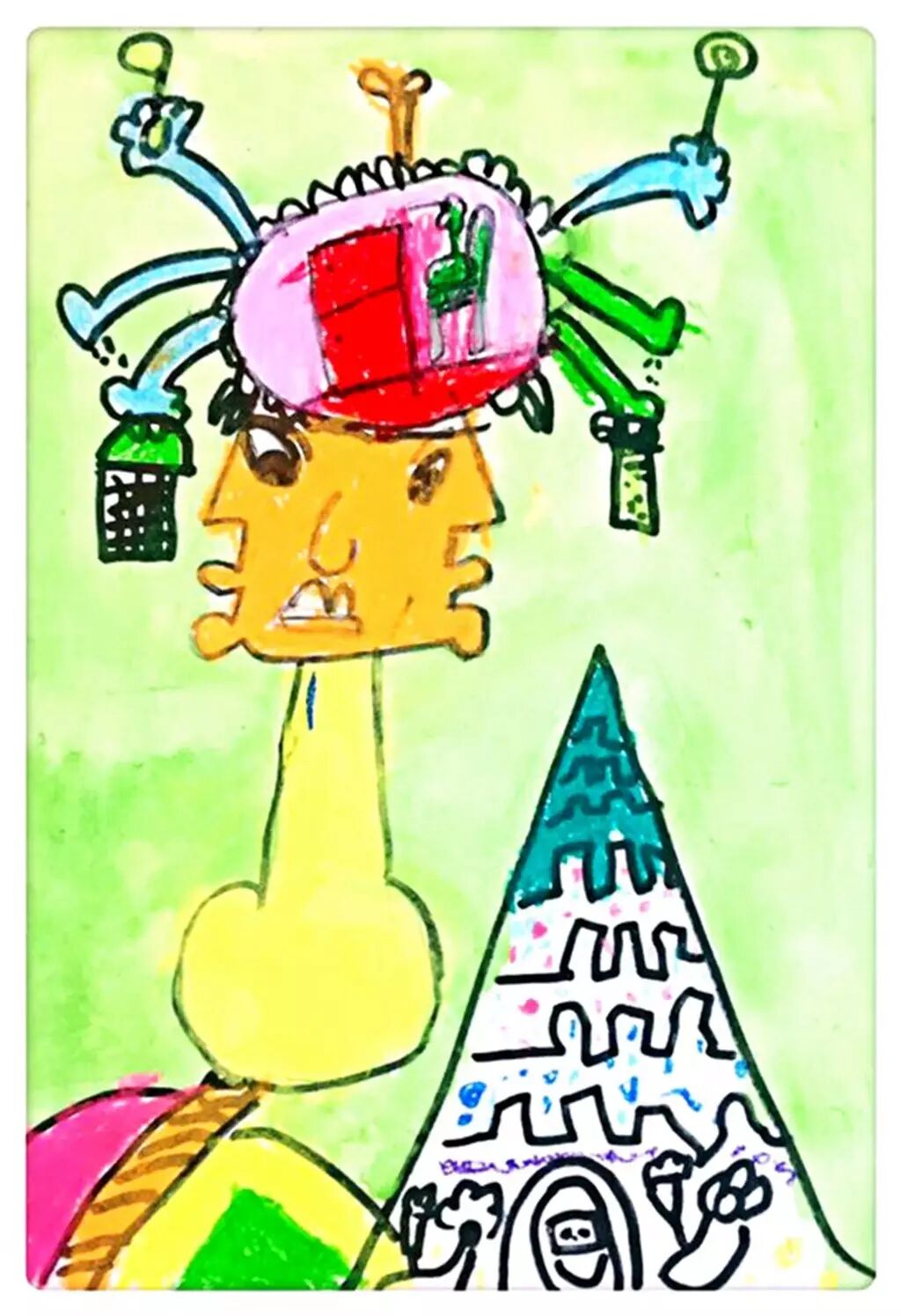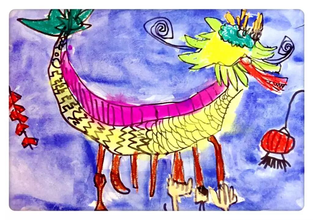 六六小朋友将我们端午节赛龙舟、舞龙船的传统节日刻画的非常有新意。弯弯的龙船以及非常有气势的龙头像弯弯的月亮,又像刚从天际边腾云驾雾飞来的龙王。旁边的鞭炮和灯笼则衬托出的节日热闹的气氛。特写的手让人产生无限的联想