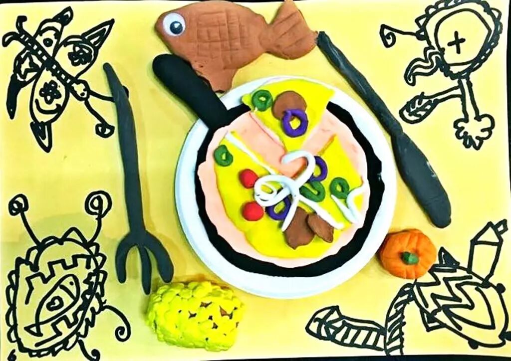 美味可口的的牛肉味披萨,泰式烤鱼、秘制南瓜。配以西式刀叉以及来自植物和外太空星球的奇妙桌布。让人秀色可餐,口齿留香。线描的运用是画作有很强的装饰效果,具有独特的视觉效果。