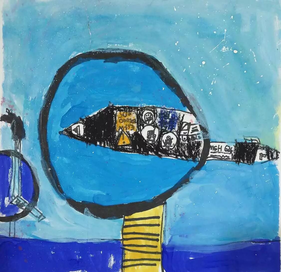 仔哥哥的每一张作品都跟生活息息相关,这是一次博物馆之旅后的一张画,镜子博物馆里面有很多的镜子;哈哈镜、老花镜、显微镜、平面镜、多棱镜等等,但是我们仔哥哥深深的被一个放大镜给吸引了,这张画面一个放大镜正在行驶他的作用,放大了一只签字笔,上面的各种标签符号在放大镜下面显得是那样的清晰,旁边还有一个放大镜在放大水管里流动的水,动静结合,很神秘的感觉