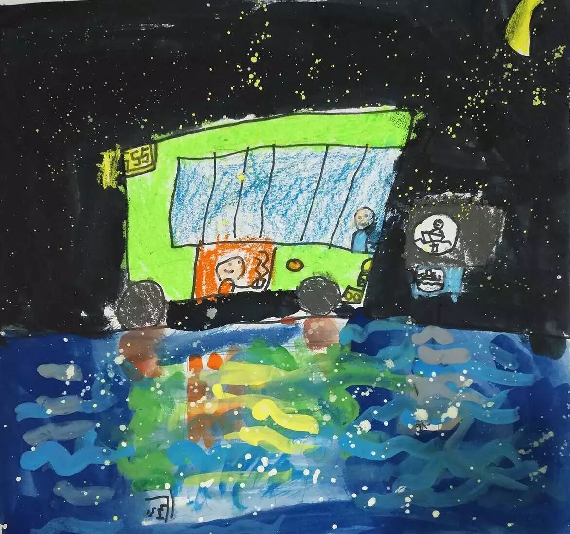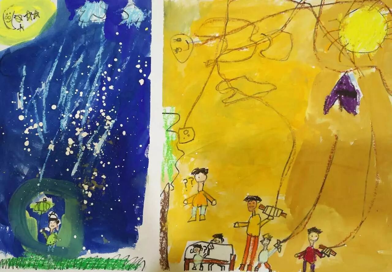 这张画仔仔不仅画出了冷暖的色调,而且画出了童年的韵味,尤其白天的放风筝的几个小孩的动态和风筝线的线,如此生动,如此舒服,简直成人都很难把控的感觉,他却很自然的画出来,可见其用心程度。