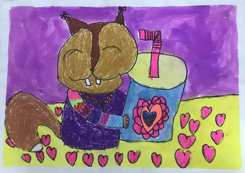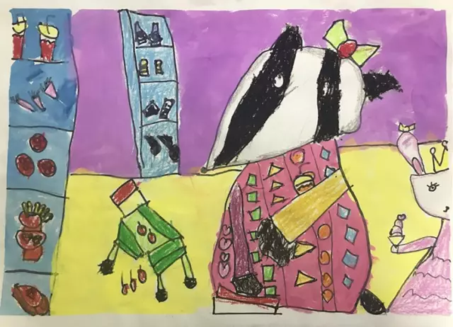 点评:今天小獾来逛超市啦,它来到一个货架前上面有它喜欢喝的各种饮料,旁边有一个坏掉的购物车,里面装的水果都掉出来啦!小朋友很有想法,画面很有故事性和趣味性,主体物比较明确,主次关系分明,色调也很统一!