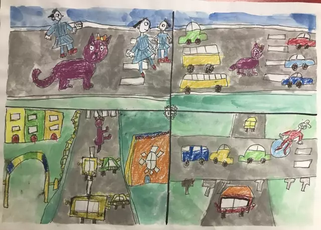 点评:今天的作品通过四格画的形式主要表现堵车的场景,一只小猫来到了马路上,人们为了躲避它而造成了拥堵,从多种角度表现堵车的场景,而且呈现了立体空间感。
