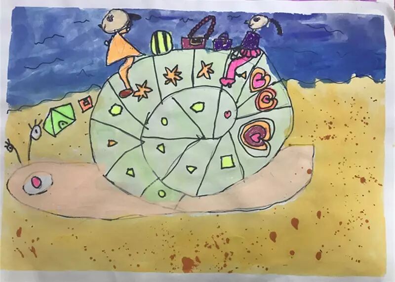 点评: 这节课主题是骑在动物身上的人,美美画的是两个小朋友骑着蜗牛去旅行,经过一段长途跋涉它们刚刚来到了北戴河,这幅画面非常有童真和趣味性,脑洞大开哦!