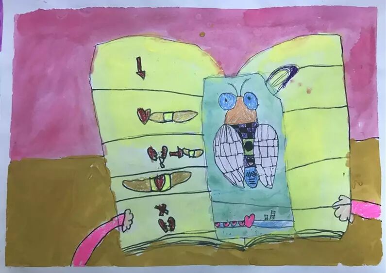 点评:今天的主题是蝉美美小朋友的蝉变成了书签上面的图案,现在被夹在了一本书里面,一个小朋友正拿着这本书,表现了拿书的动态!蝉身上用了点线面进行装饰,整幅画面色调非常小清新,具有装饰性色彩!