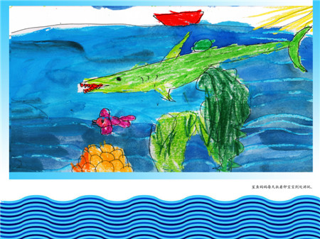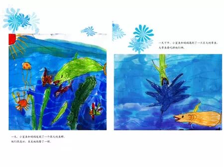 一天,小鲨鱼和妈妈发现了一个很大的鱼群,他们很高兴美美的饱餐了一顿。