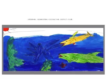 鲨鱼妈妈趁机吃掉了大章鱼一只大手,小鲨鱼从空中落下来,也吃掉了大章鱼另一只大手,终于,鲨鱼妈妈和宝宝吃掉了这只大章鱼。