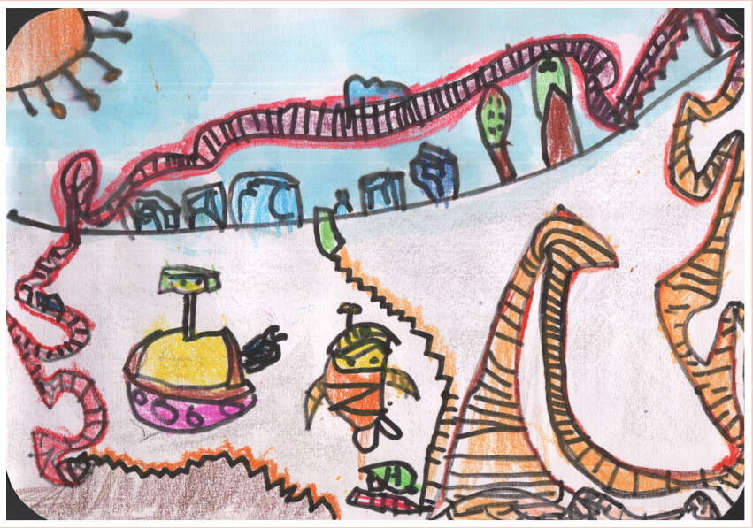 带着 EVA 和 LIPE 来到了有过山车的游乐园玩儿, 过山车速度好快啊,不一会儿就到达了终点。 下了过山车,他们一直往前走, 从游乐园出口出来。