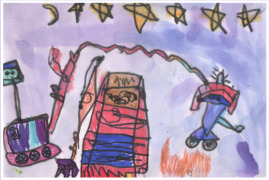 WALL-E 站在高高的舞台上表演飞行舞,大家都觉得非常好玩又好笑—因为他背后背着一个在喷射的灭火器,所以才能飞来飞去,舞会在欢快的气氛中进行着…….