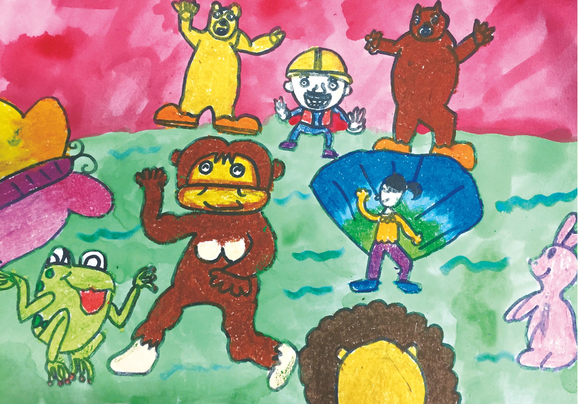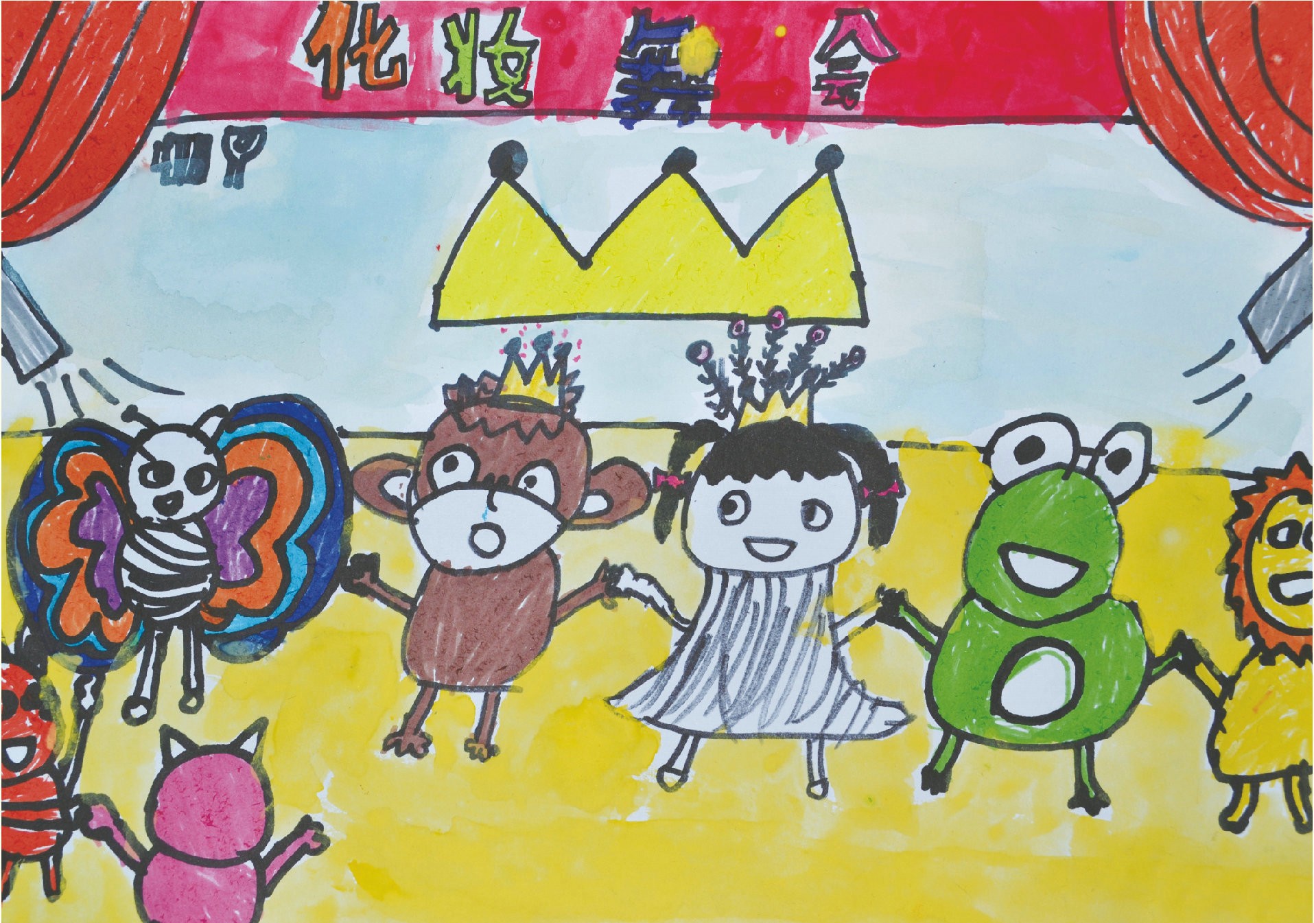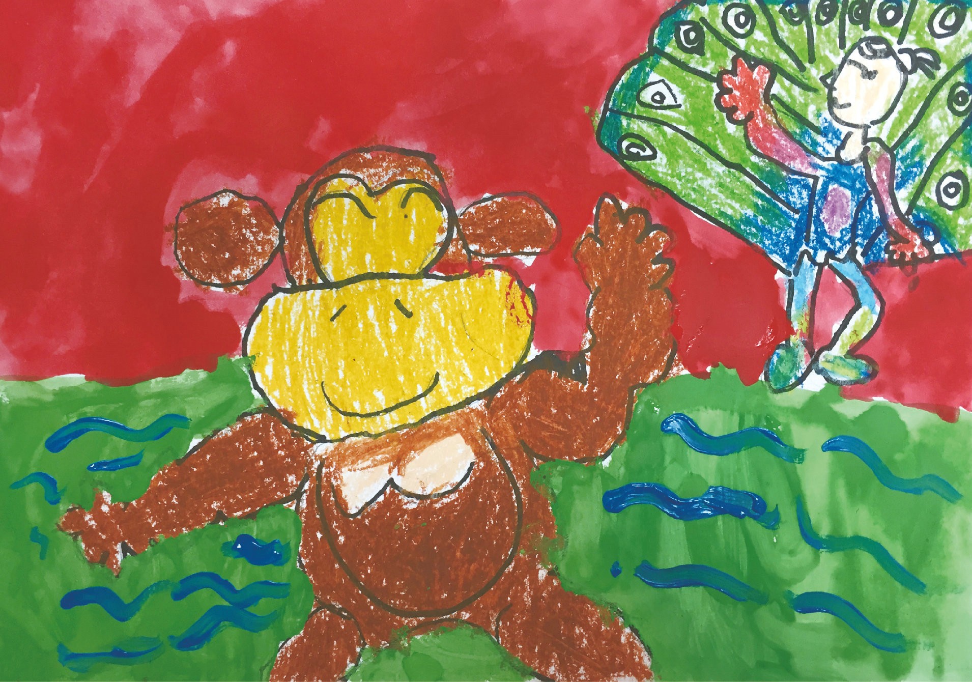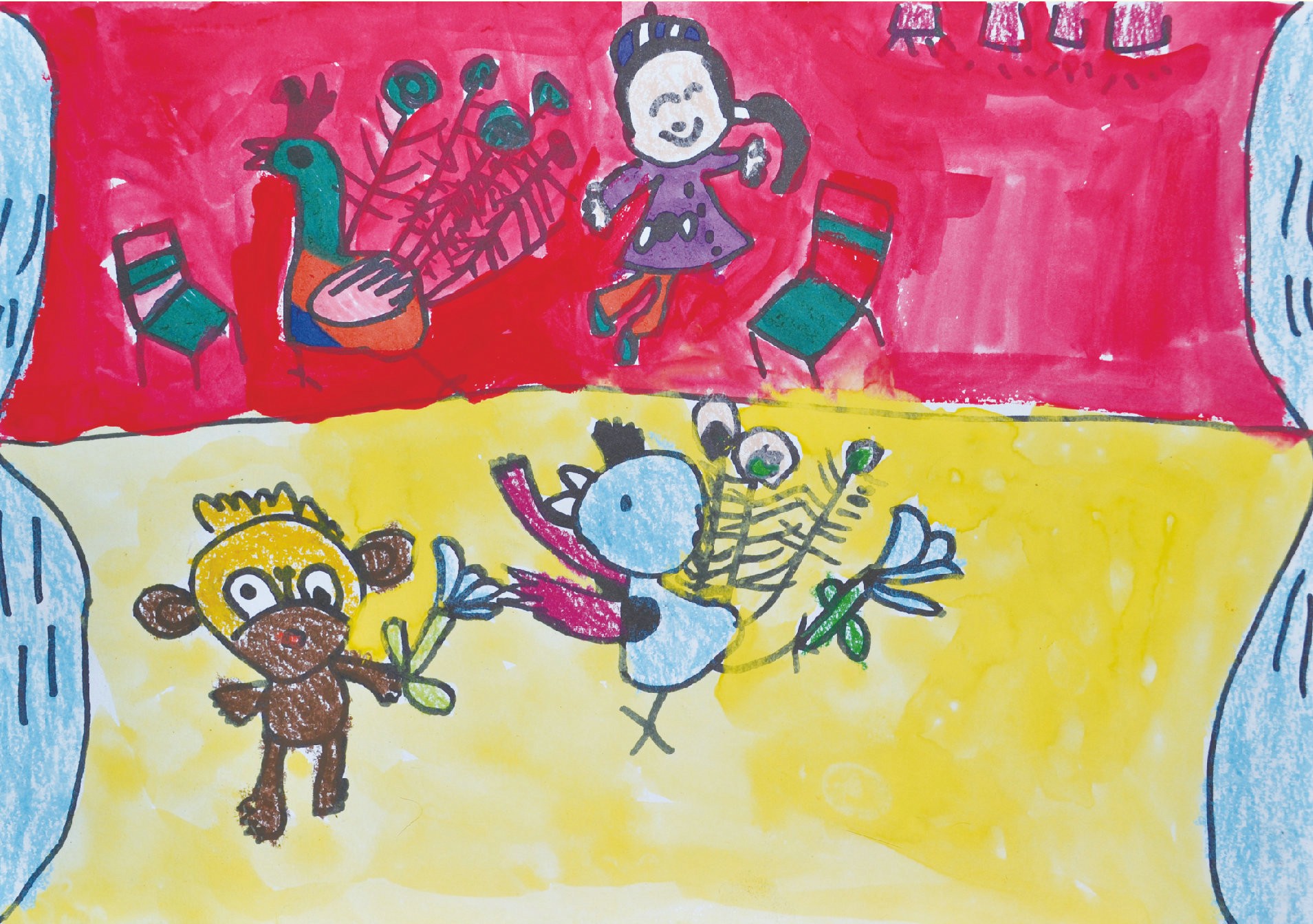 作品名称:大家高兴的祝贺小猩猩和小孔雀
