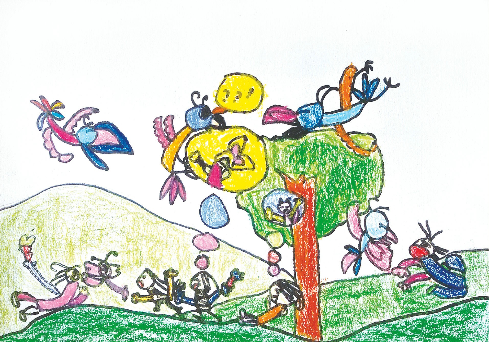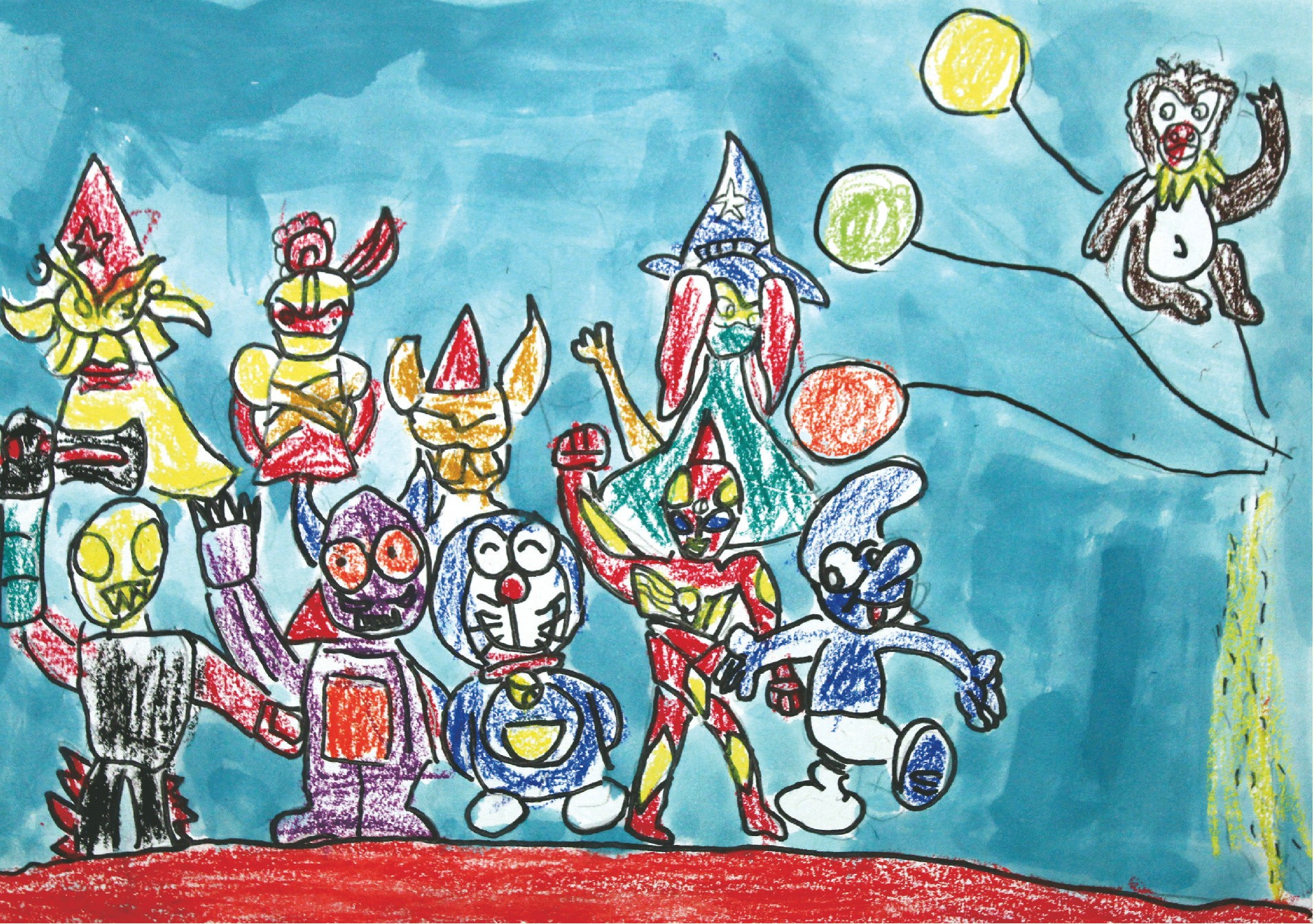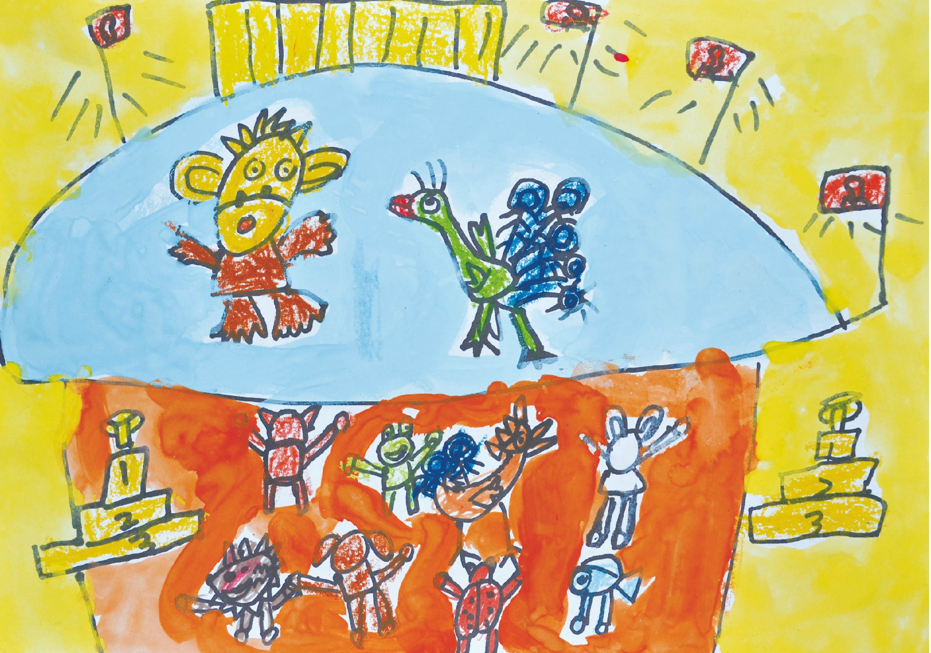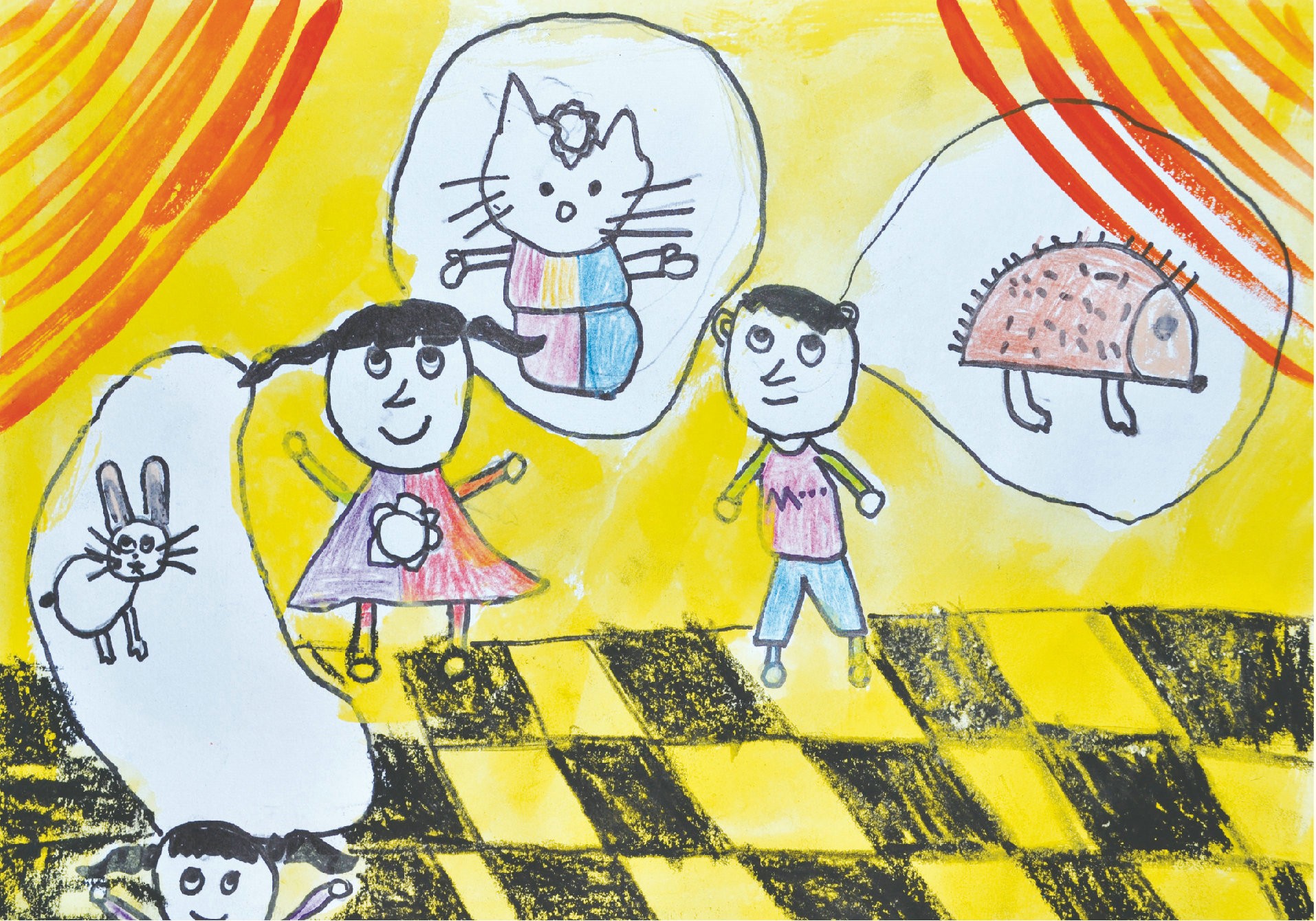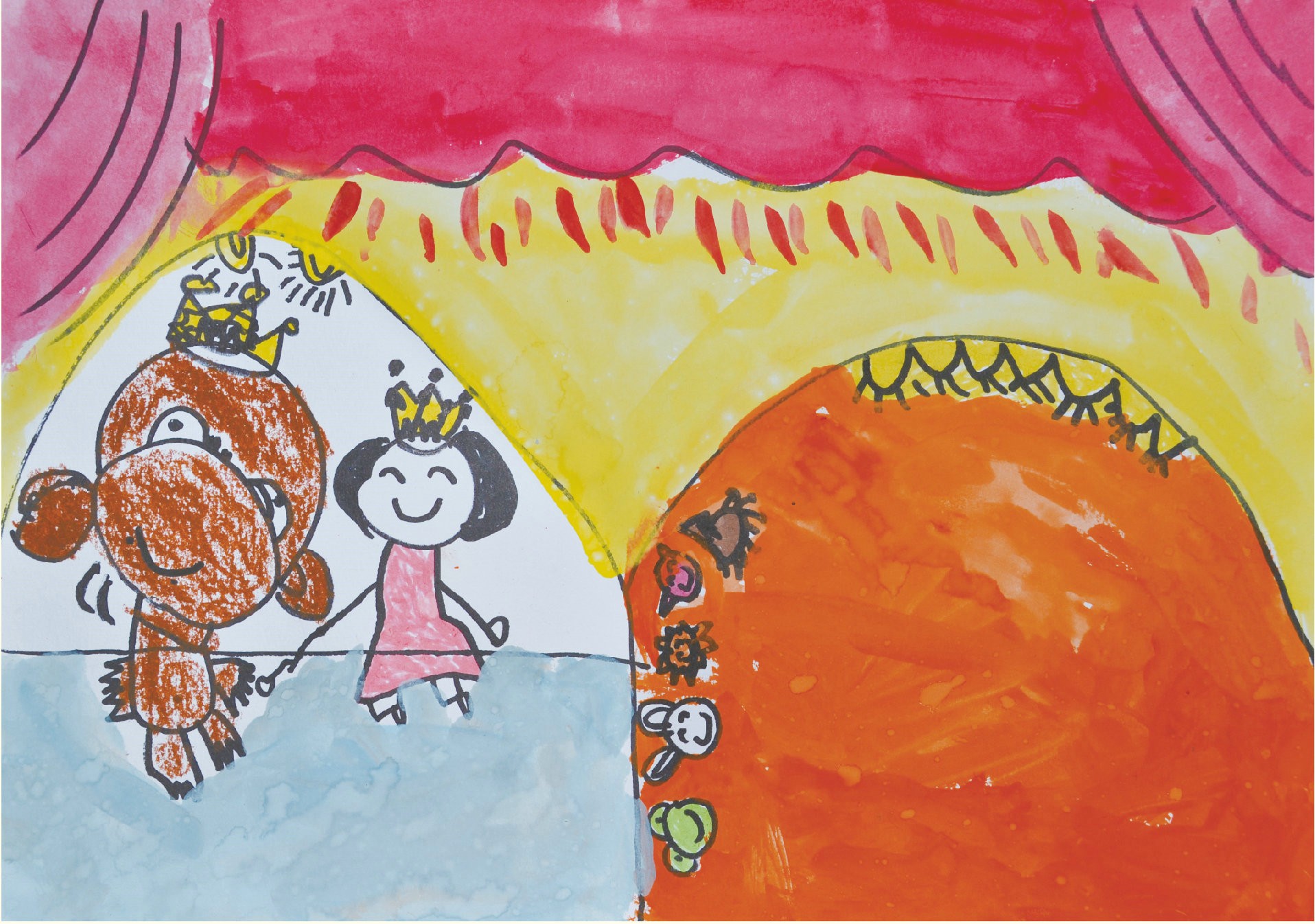 作品名称:大家高兴的祝贺小猩猩和小孔雀