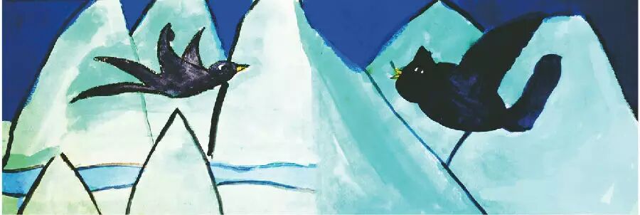 雪停了,它飞过一个山谷,遇到了一只燕子。