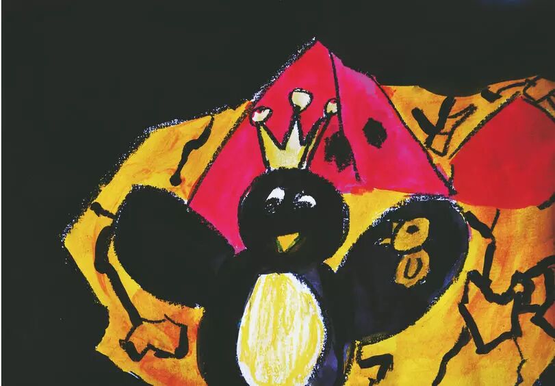 它钻进了一个洞里,站在企鹅国王的翅膀上。