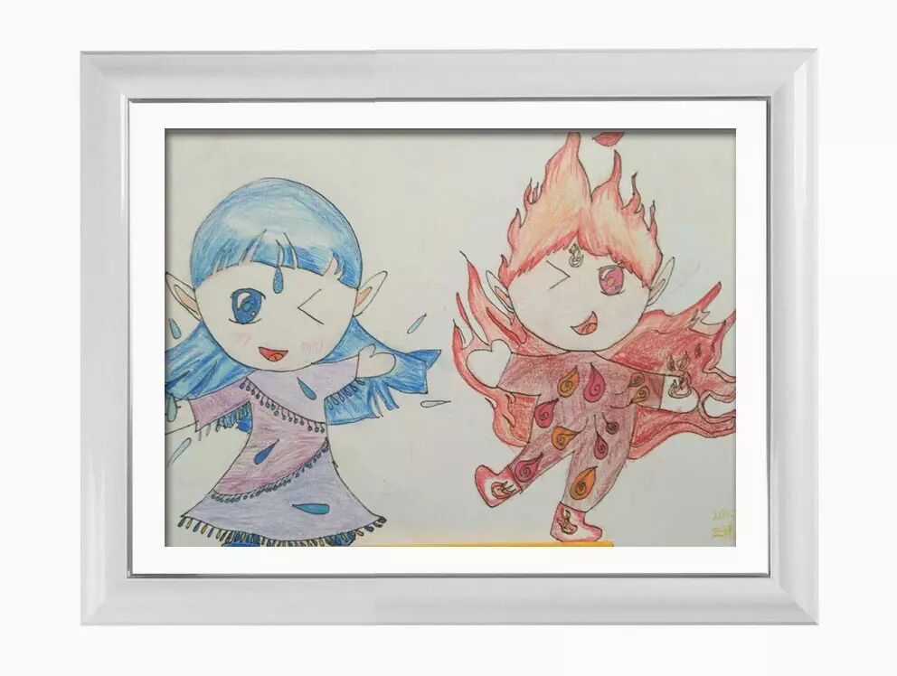 作品说明:某个孩子捡了两个水晶球,就带回家了,一个上面带着水珠,一个上面带着火焰,那个小孩非常喜欢这两个球,两个球在被子里,越打越大,第二天,发现两个娃娃在那边打闹,一个蓝色的,一个红色的。他们两个说,哎呀,你醒了,我是火娃,我是水娃。那个小孩,表现的很惊讶,然后说,你们在家待着吧,我上学去了哦。故事的名字叫做《火娃和水娃》。