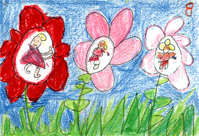 她们玩了一会,就去花朵里看水晶宝石在不在,宝石还在上面,她们很开心。
