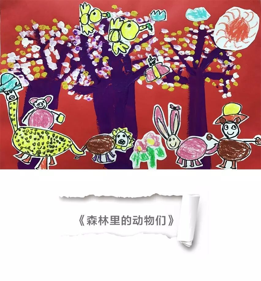 森林里的动物们,宝贝通过主题表现出森林里除了有动物还有大树,大树采用了水粉厚涂的方法表现出来的,而主体物动物用了剪贴的方法来表现,这样更能突出主体,显得画面也更有层次感!