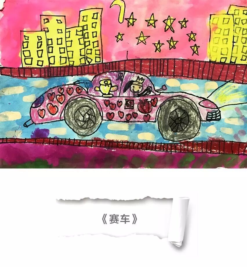 这节课的主题是赛车,清雯通过主题,画出了自己喜欢的赛车造型,而且选用了自己喜欢的颜色充分的表现了自己的想法,色彩运用艳丽,很不错的一幅绘画作品!