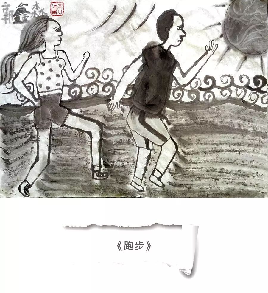 了解跑步的人物动态的过程,迈腿身子微曲前倾,跳跃大迈步,四肢交替。跑步的动态的捕捉和观察。画中两个人在晨练,一前一后,场景给人积极阳光的美感。两人动态轻盈,迈开步伐,四肢微曲,眼神五官坚定。画面用简单的墨色和线条丰富了人物的衣着。